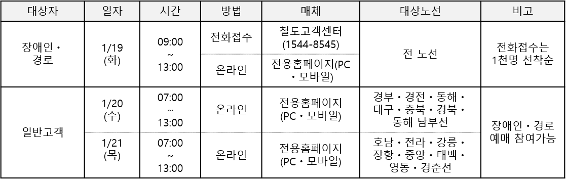 - 잔여석 승차권 판매: 2021.1.28.(목) 15:00 ~