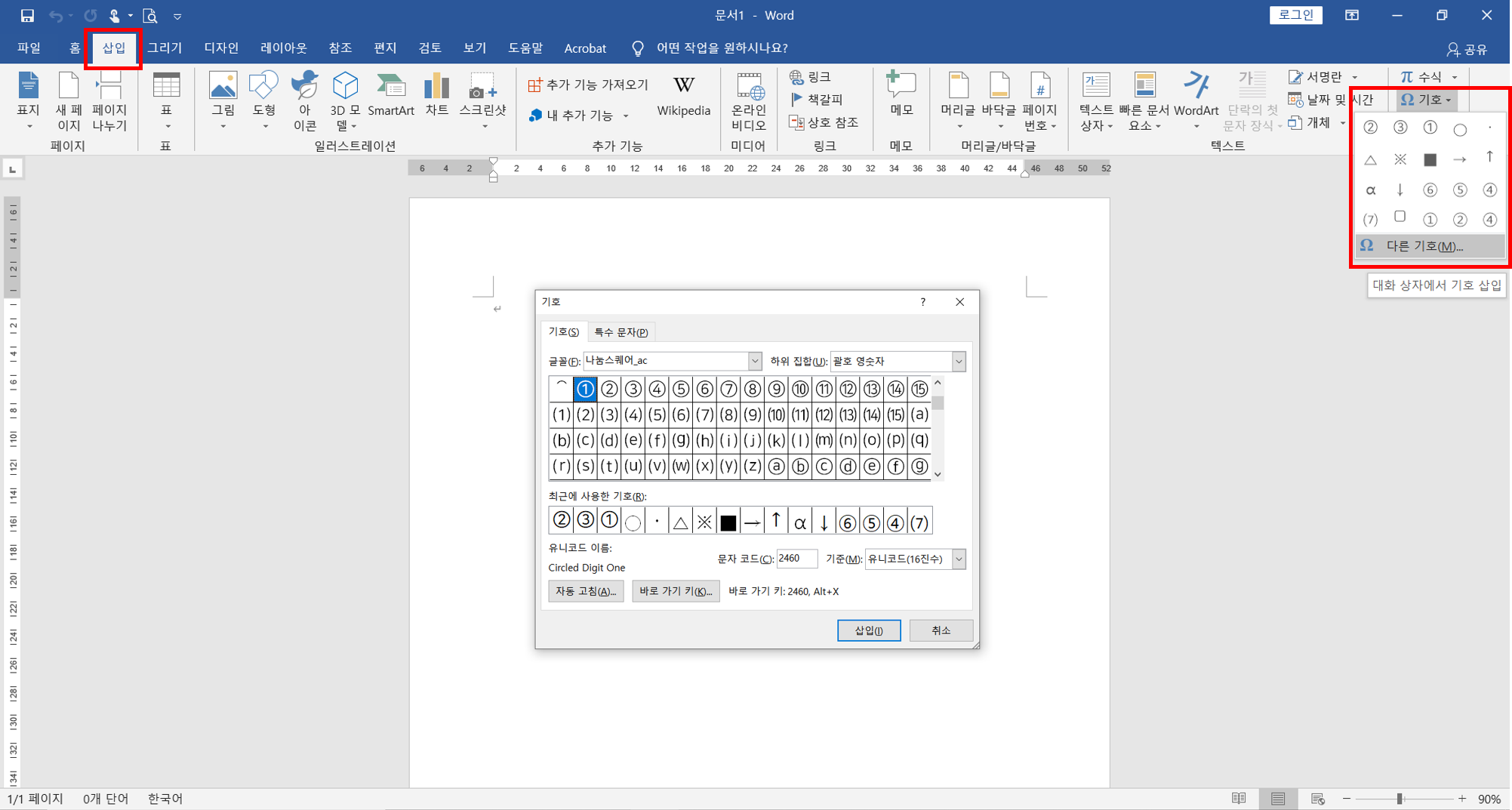 한글이였으면 자음+한자키를 누르면 되지만 워드는 한자키기 먹히지 않는다. 아쉽지만 아래와같이 사용해야되서 불편하다.