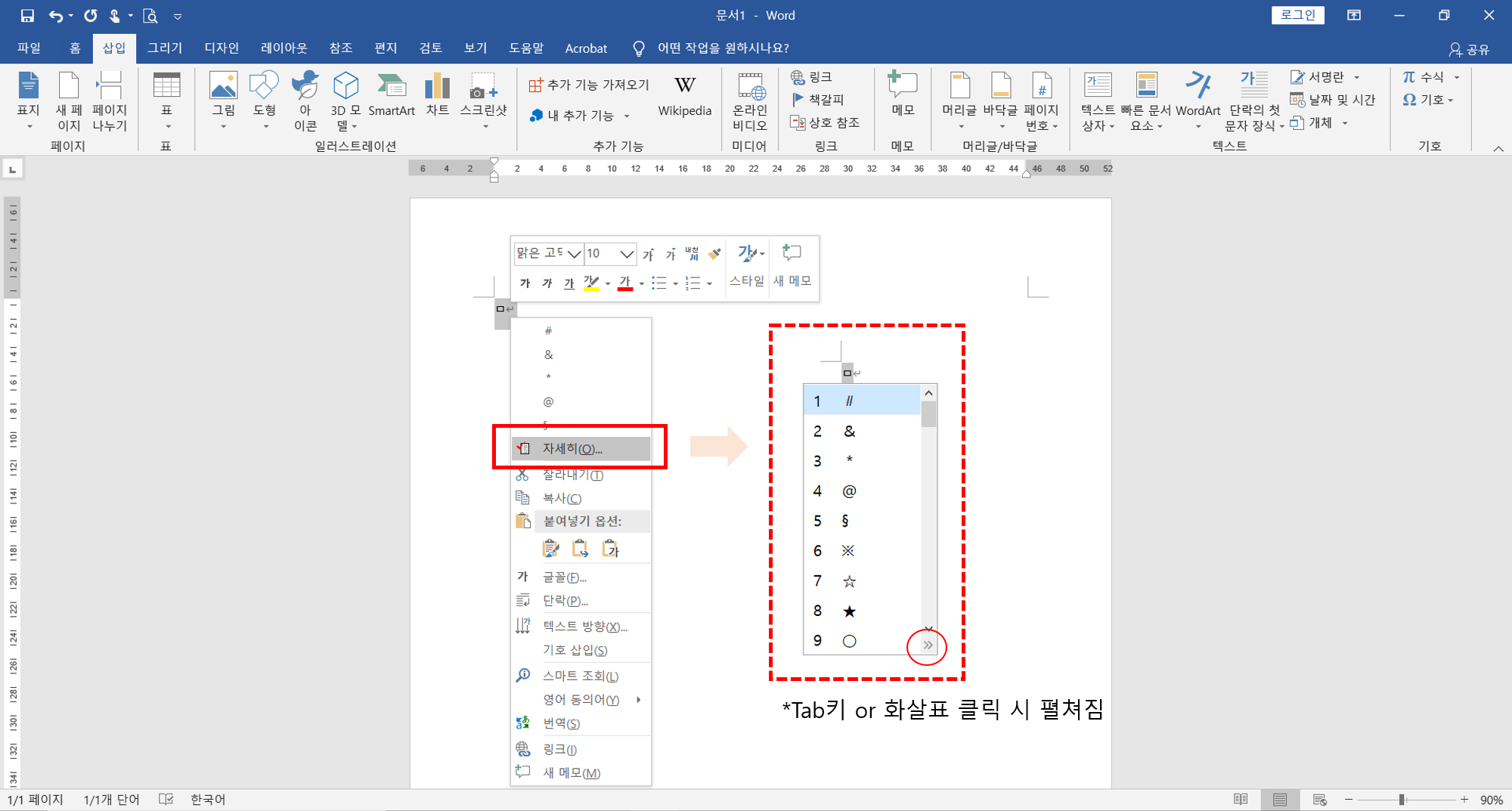 ② 자음 (ㅁ,ㄴㄷ,ㄹ 등) 입력 → 마우스 우클릭 → 자세히