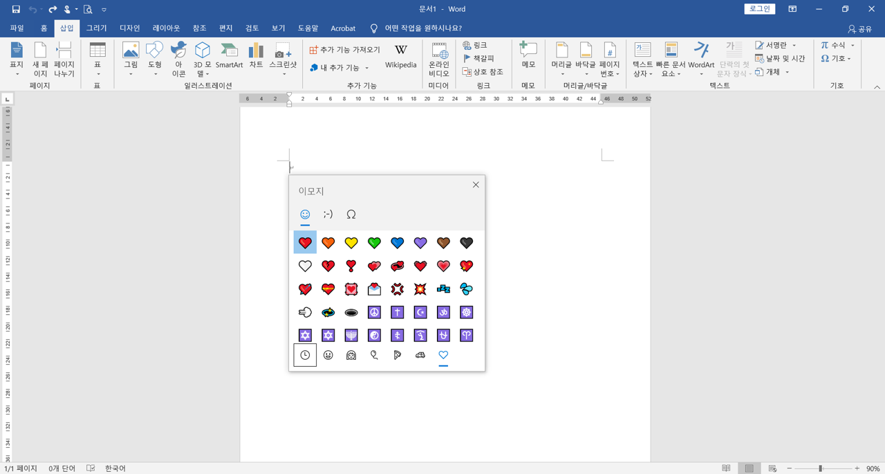 윈도우키와 마침표를 누르면 이모지 창이 뜨면서 여러가지 기호와 간단한 이모티콘을 삽입할수 있다. 하지만 워드에서는 아쉽게도 이모티콘은 출력이되지 않는다.