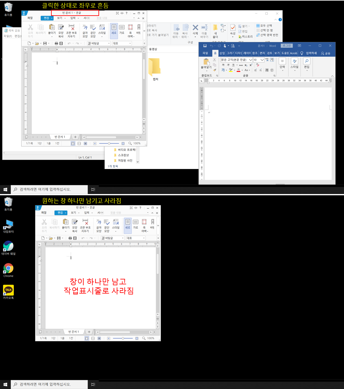 4. 창을 클릭한 상태로 좌우로 흔들면 흔들었던 창 외에 다른 창들은 화면에서 사라진다(작업표시줄로 사라짐)