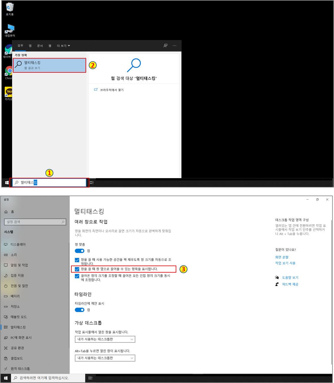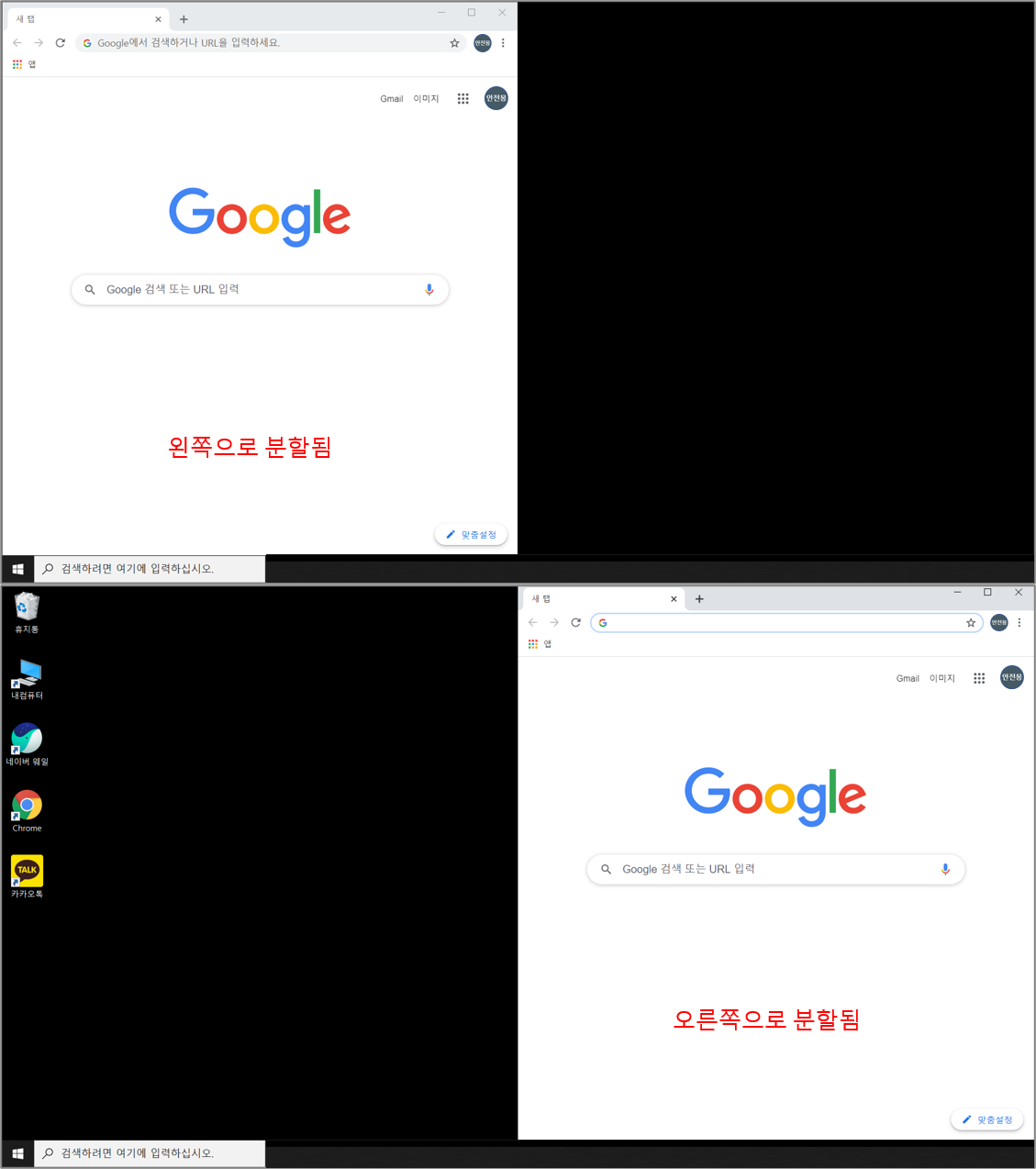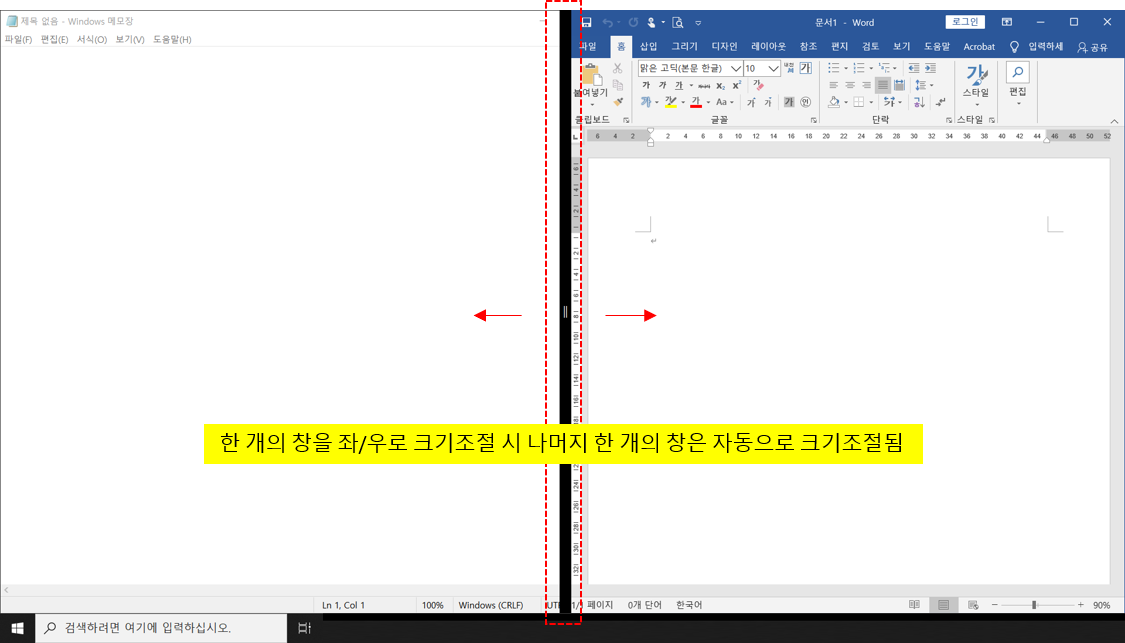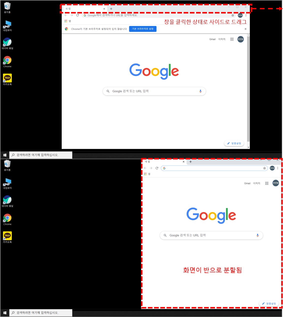 1. 창을 선택 후 드레그하여 화면 사이드로 움직이면 화면의 반으로 분할됨