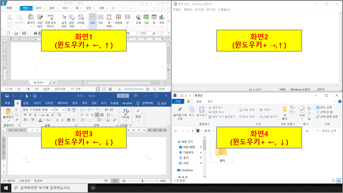 3. 화면이 반으로 분할된 상태에서 윈도키 + 방향키(↑or↓)를 누르게 되면 화면이 4 분할됨