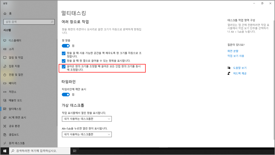 이제는 웬만한 회사에서는 전부 윈도 10으로 바뀐 것 같다. 기존 윈도를 사용하던 사용자들은 새로운 기능에 관심이 없거나 똑같을 것이라고 생각하는 경우가 많은데 상당히 편리한 기능이 많아진 것 같고 화면 분할 기능도 그중 하나라고 생각한다.
