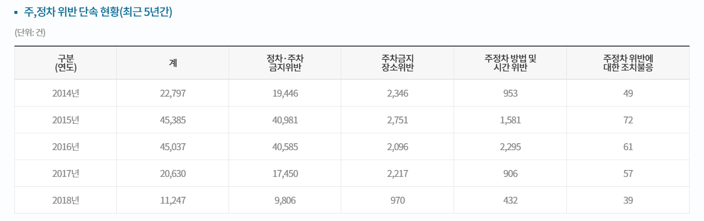 한 가지 아쉬운 점은 주정차 위반으로 인한 단속건수는 줄어들고 있는데 처벌기준이 너무 강화하는 것은 아닌가 생각해본다. 물론 일반적인 주차장소가 아닌 어린이 보호구역 내 주차이므로 별개로 볼 수도 있지만 요즘 보면 너무 처벌 강화를 통해 실적을 올리려고 하는 것이 안타깝다.
