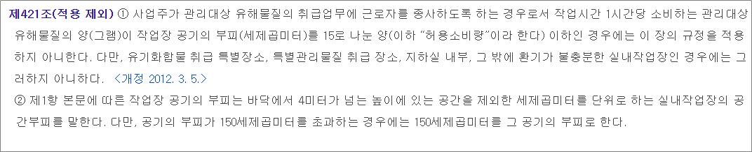 - 관리대상 유해물질의 허용소비량을 초과하지 않는 작업장(보건규칙 제421조)