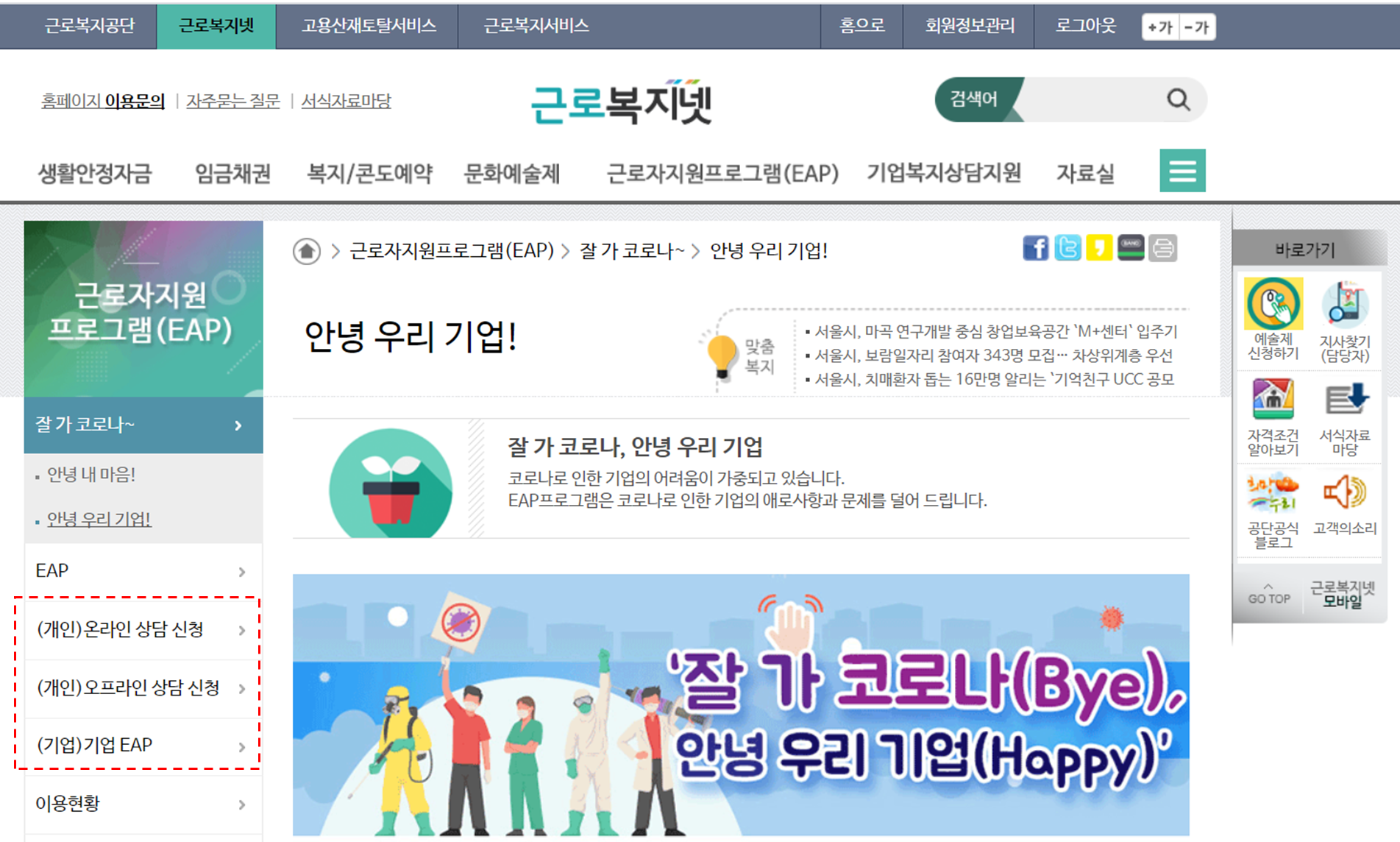 근로복지넷 로그인 후 개인 및 기업 탭에서 받고 싶은 상담 신청을 클릭하여 진행하면 됩니다.