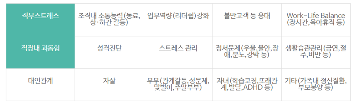 직무스트레스 조직내 소통능력(동료, 상ㆍ하간 갈등) 업무역량(리더쉽) 강화 불만고객 등 응대 Work-Life Balance(장시간, 육아휴직 등) 직장내 괴롭힘 성격진단 스트레스 관리 정서문제(우울,불안,장애,분노,강박 등) 생활습관관리(금연,절주,비만 등) 대인관계 부부(관계갈등,성문제,맞벌이,주말부부) 자녀(학습코칭,또래관계,발달,ADHD등) 기타(가족내 정신질환, 부모봉양 등) |