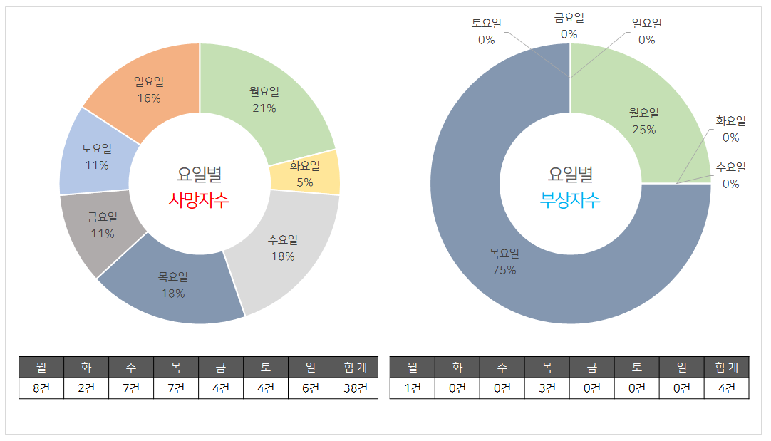 요일별 사망사고 발생건수는 월요일에 8건으로 가장많이 발생되었고 수(7건), 목(7건), 금(4), 토(4건) 화(2건) 순으로 발생되었습니다.