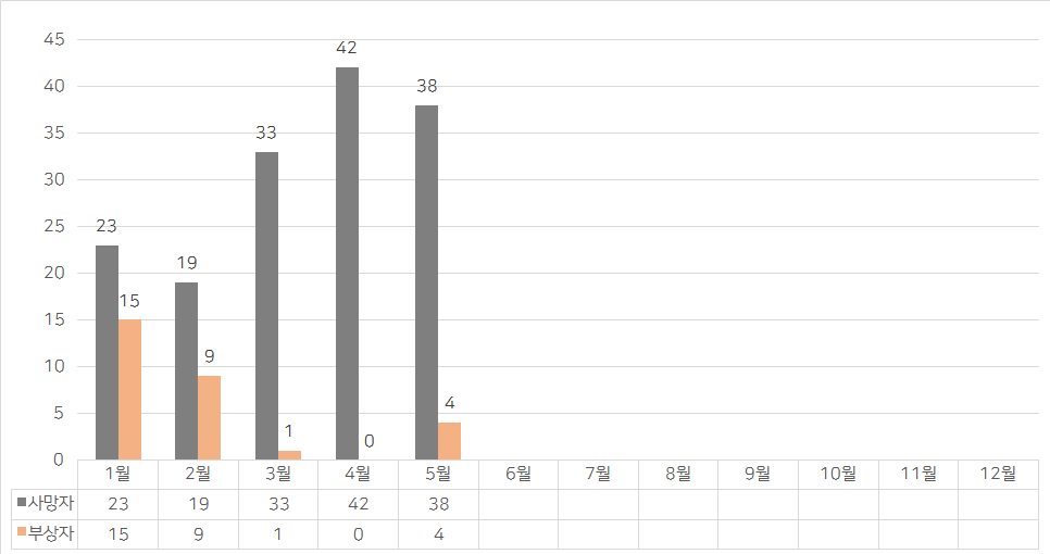 5월 사망자는 38명으로 전월 42명보다 4명이 줄었지만 아직도 높은 수준을 유지하고 있습니다. 코로나19로 인해 위축된 상황에서도 이렇게 사망자가 많이 발생된다는것은 문제가 있는것같습니다.