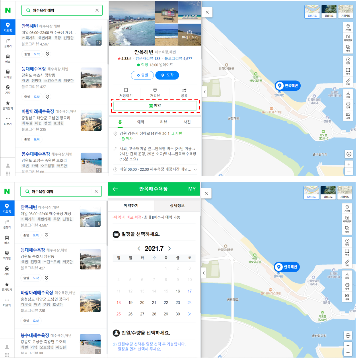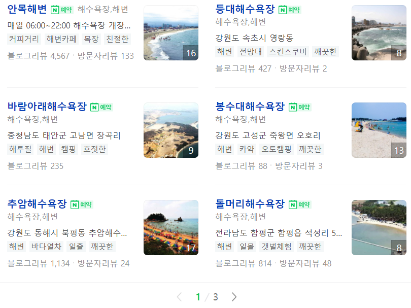 네이버 검색창에서 해수욕장 예약을 검색하면 예약 가능한 해수욕장 목록이 나오는데 가고 싶은 곳을 선택하여 예약을 진행하면 됩니다.
