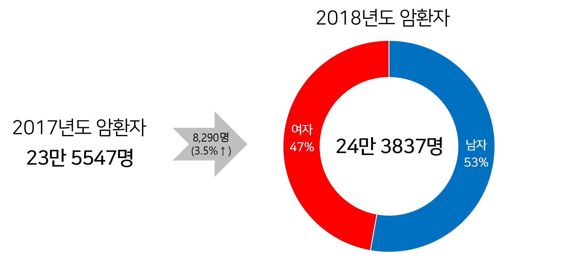 암 관련 통계자료를 보면 2018년 신규 발생한 암환자는 24만 3837명으로 전년(23만 5547명)에 비해 8,290명(3.5%) 증가하였다.