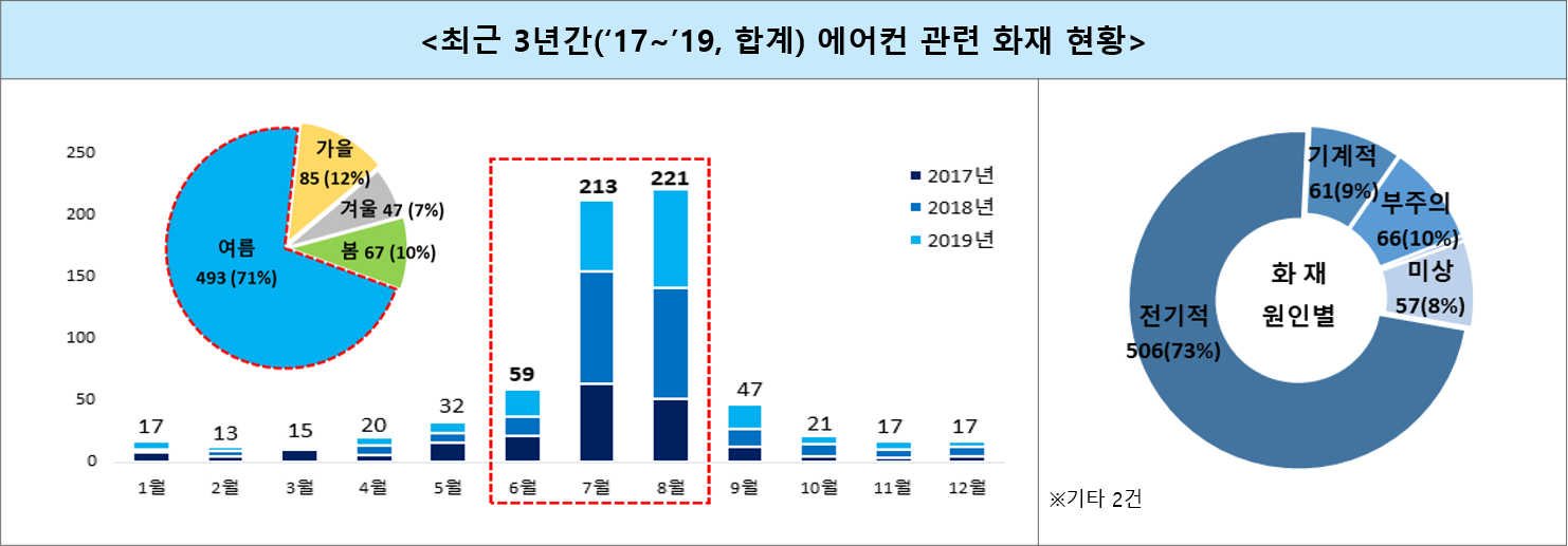 - 에어컨 화재의 71%(493건)가 무덥고 습한 날씨로 사용이 많은 여름철(6월~8월)에 집중적으로 발생