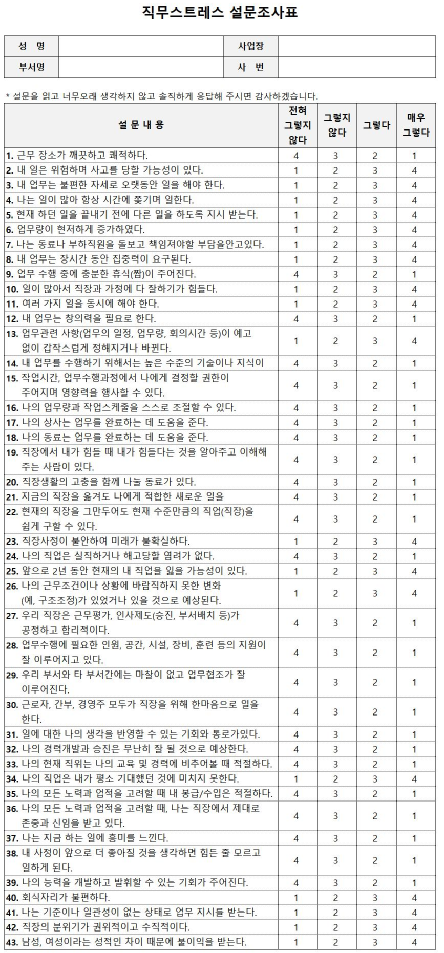 상기 평가표를 통해 직무스트레스 요인을 파악하여 예방 프로그램을 운영하기 위한 기초자료로 활용한다.