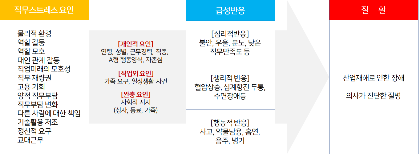 | 직무원인 | - 직무스트레스의 가장 큰 원인은 업무의 불균형 - 업무량이 높거나 노력에 비해 보상이 적절하지 않을 시 발생 |