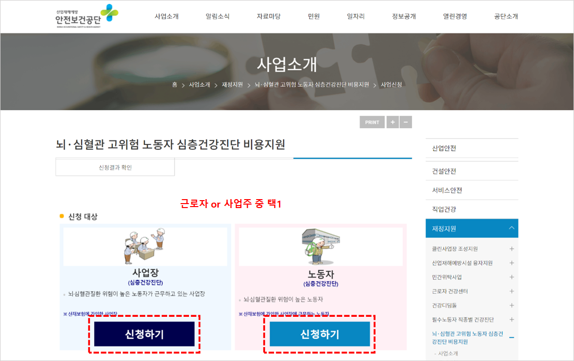 홈페이지 접속 ▶ 자주 찾는 항목 ▶ 뇌ㆍ심혈관질환 예방 심청 건강진단 비용 지원 ▶ 사업신청
