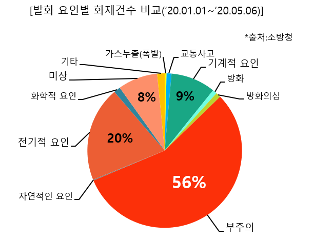 아래 그래프에서 보시다시피 절반 이상의 화재가 부주의에 의해 발생되고 있습니다. 조금 더 세심한 주의가 필요로 하는 시기가 아닌가 생각해봅니다.