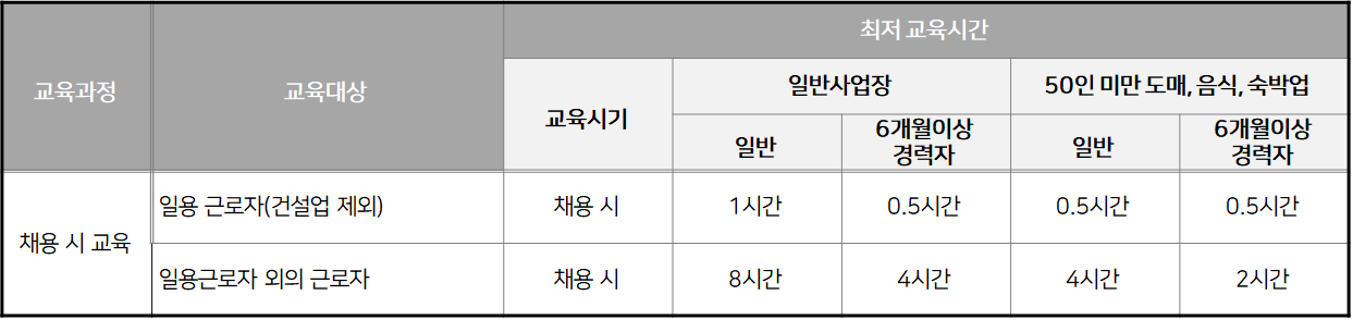 | 채용 시의 교육 | 한국표준산업분류의 세분류 중 같은 업종에 6개월 이상 근무 경력이 있는 근로자에 대한 채용시 교육을 실시한 경우 |