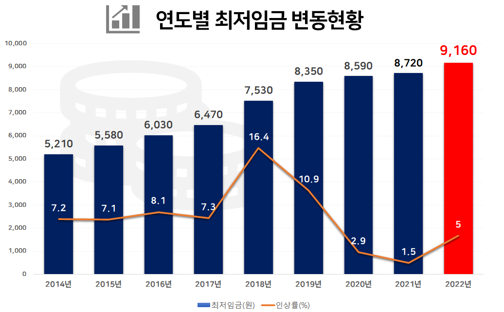 최저임금은 440원(5.04%) 오른 9,160원 입니다.