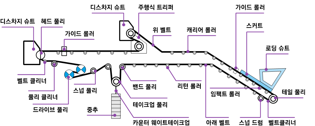 수평, 경사된 긴 프레임의 양끝에 풀리를 놓고 환상의 벨트를 풀리와 테일풀리 사이에 감아서 연속적으로 한쪽 방향으로 움직여서 그 벨트위에 물건을 적재하여 운반하는 컨베이어