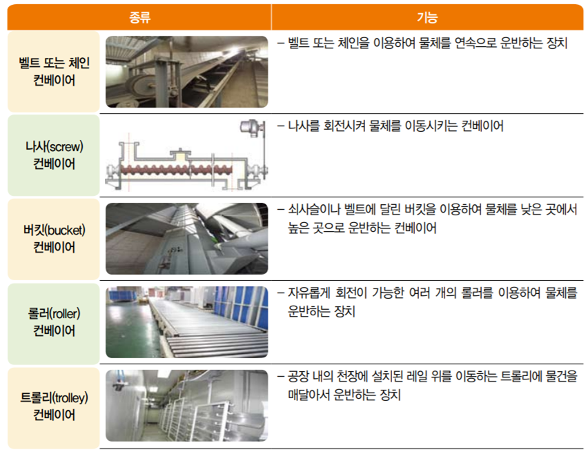 컨베이어란, 재료・반제품・화물 등을 동력에 의하여 단속 또는 연속 운반하는 기계장치를 말한다.