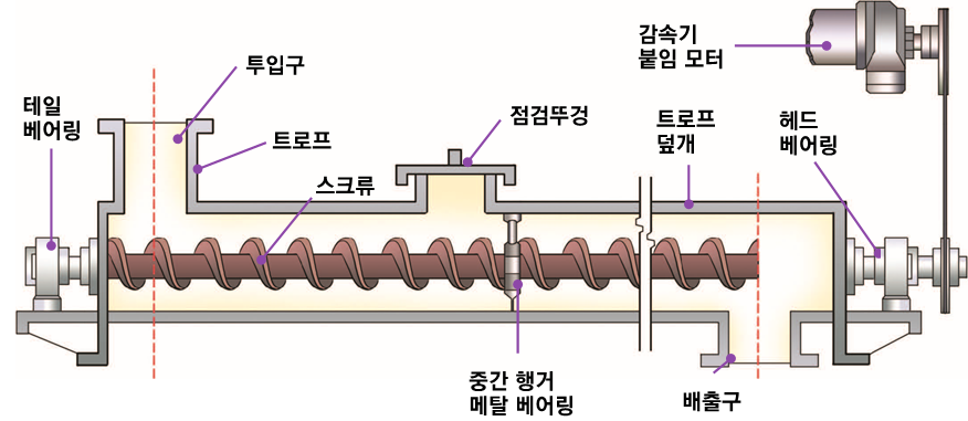 U 자형 또는 O 자형의 밀폐된 케이싱(Casing) 내에 나사모양의 날개(Screw)를 회전시켜 운반물을 날개 1회전에 대해 나사의 피치(pitch)에 상당 하는 길이만큼 이송하고 연속회전에 의해 운반물을 배출구까지 운반하는 설비
