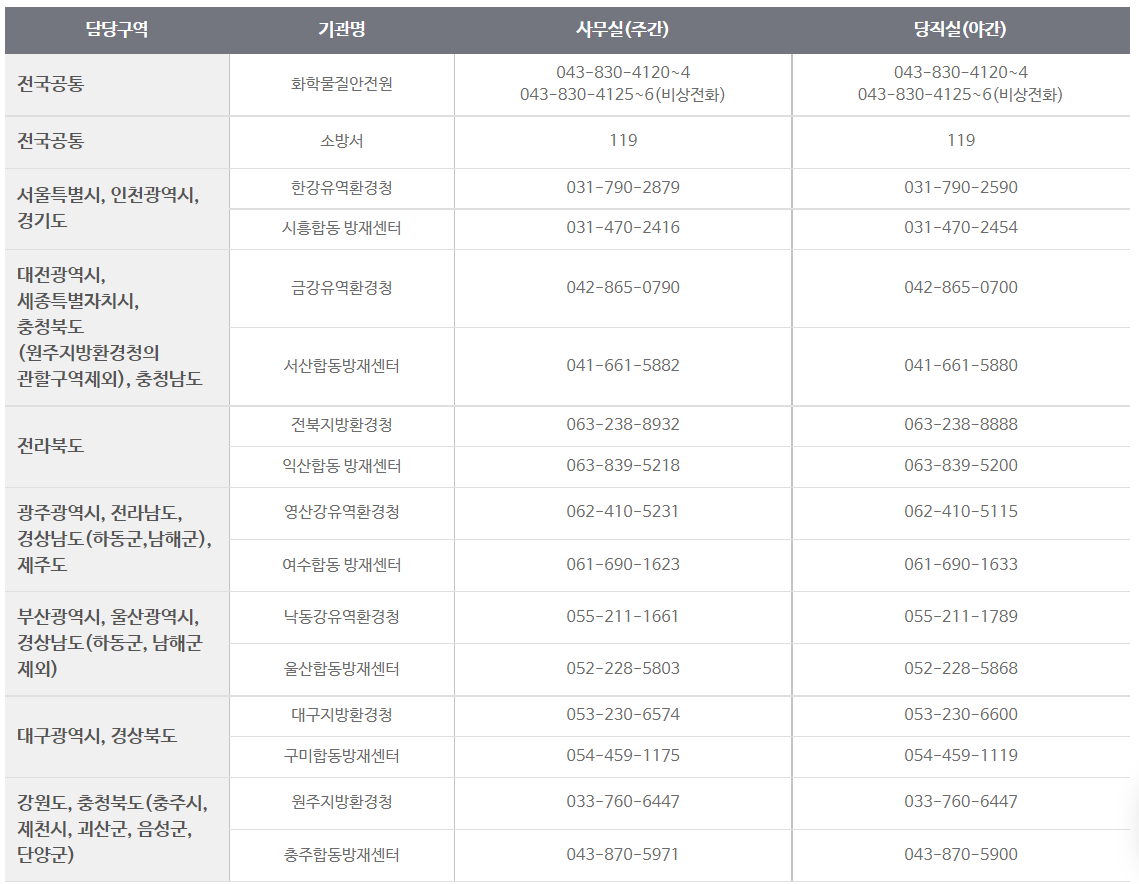 화학사고 발생 시 아래 연락처로 신고내용을 포함하여 신고하시면 됩니다.