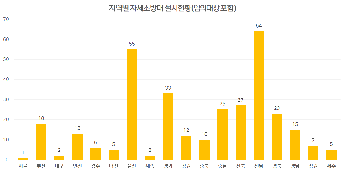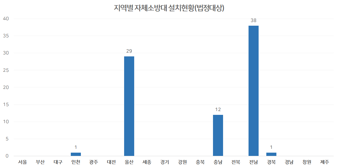 법정대상 자체소방대 설치현황을 보면 81개소가 운영중 이며 전남이 38개소로 가장많은 자체소방대가 있으며, 울산29개소, 충남 12인천과 경북에 각각 1개소를 운영중 입니다.