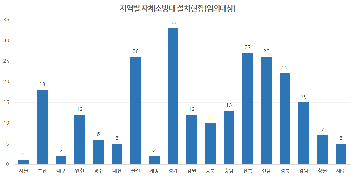 임의대상 자체소방대 설치현황을 살펴보면 242개소의 자체소방대가 설치되어 운영중이며, 경기도가 33개소로 가장많이 운영중입니다.
