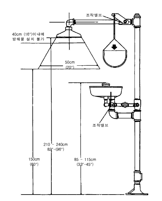 - 긴급샤워기의 조작밸브를 여는 경우 조작밸브가 1초 이내에 열리고 열린상태로 있는 지를 확인한다.