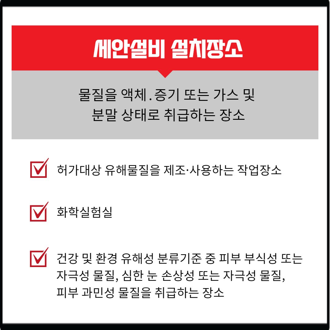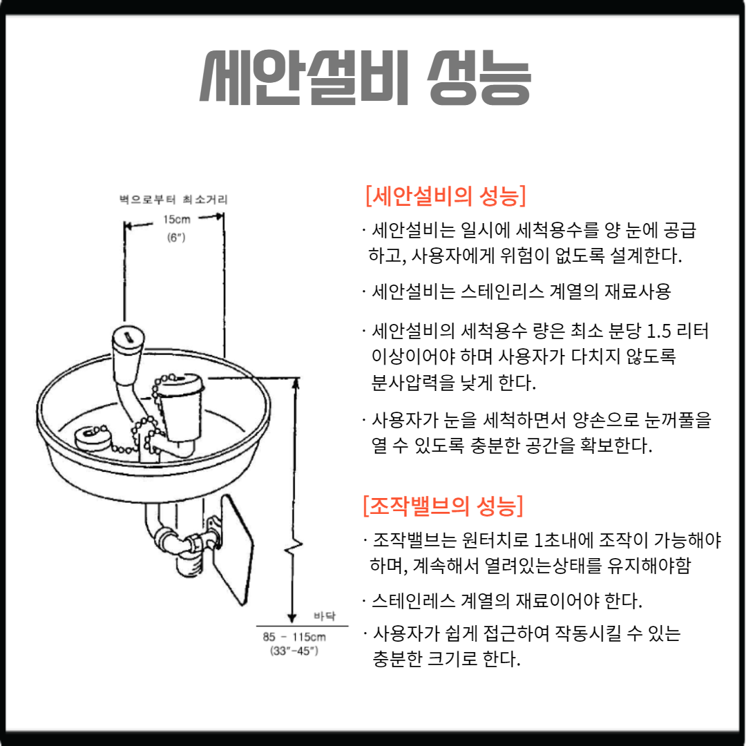 사업장에 세안설비를 설치하는것도 중요하지만 유지관리 하는것이 더욱 중요하다고 생각합니다. 주기적으로 작동상태를 점검하고 세척을 통해 항상 사용할 수 있는 상태로 관리하여야 합니다. 안전관리자의 업무는 점검표를 만들고 배포하여 주기적으로 시행할 수 있도록 교육하고 결과를 확인하는 방법으로 진행하면 좋겠죠.
