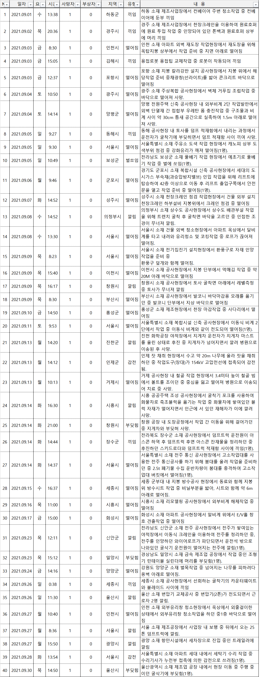 2021년 9월 사망사고 속보현황 (안전보건공단 자료참고)