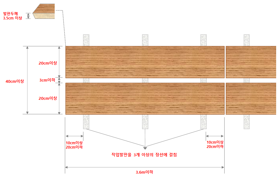 - 작업발판으로 사용할 판재의 치수는 폭이 뚜께의 5~6배 이상 되어야 하고 작업발판의 폭은 40cm이상, 두께는 3.5cm이상 길이는 3.6m 이내 이여야 한다.