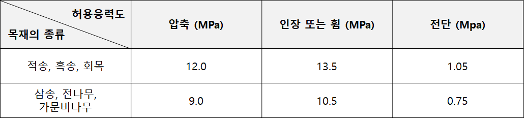 - 작업발판으로 사용하는 목재는 옹이, 갈라짐, 부식 및 변형 등이 없는 것으로 강도상의 결점이 적어야 하며 허용한도는 다음 조건이 충족되어야 한다.