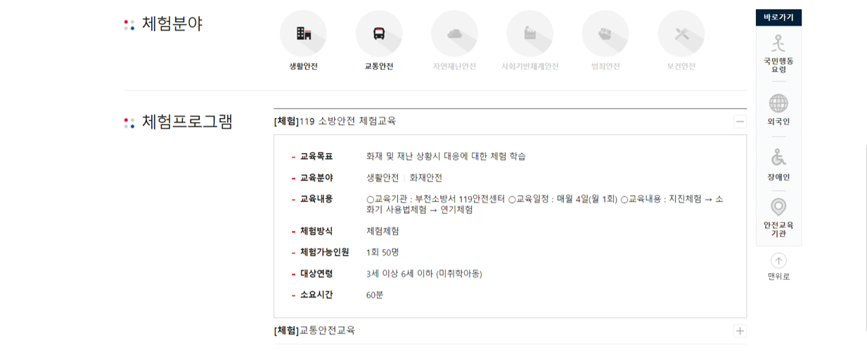 우리나라도 행정안전부에서 안전체험관을 운영하고 있는데 이를 아는 사람은 많지 않고 이용자들 대부분이 어린이집에서 주관하는 교육일 것이다. 부모들도 관심이 없기 때문이다.