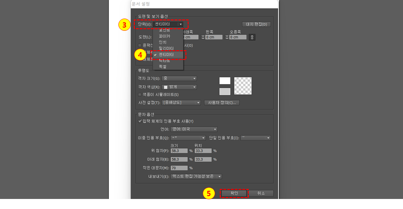 - ①파일(file) → ②문서설정(Document setup)_단축키(Alt+Ctrl+P) → ③단위(Unit) → ④센티미터 선택 → ⑤확인