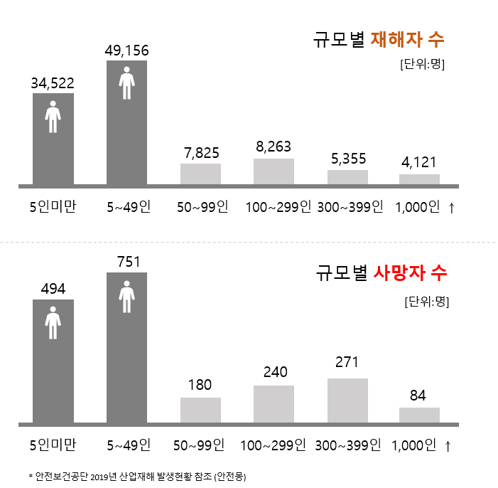 위에 안전보건공단 통계만 보더라도 50인 미만의 사업장에서 대부분의 재해가 발생되고 있는것이 보입니다. 중소기업 입장에서는 살아남는 것이 우선이기에 안전에 관심이 별로 없는 경우가 많습니다. 규모가 작다고 다 관심이 없는 것은 아니지만 대부분 영세한 사업장의 경우 안전은 없는 것이나 마찬가지입니다.