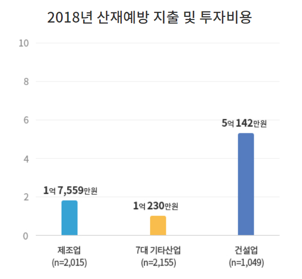 하지만 대부분의 대표이사는 사업을 지속적으로 영위하기 위해 안전보다는 생산, 원가 쪽을 더 신경 쓸 수밖에 없다고 생각하는 경우가 많고 언제나 위기란 말을 무기로 안전에 대한 투자는 소홀하다. 아래 표를 보면 보다 정확하게 현 상황을 알 수 있다. 건설업의 경우에는 안전관리비가 법적으로 책정되기 때문에 당연히 투자비용이 높을 수밖에 없는 것이고 제조업은 그에 반해 자율에 맡기다 보니 사고 가발생되지 않는 이상 투자를 쉽게 하지 않는다.