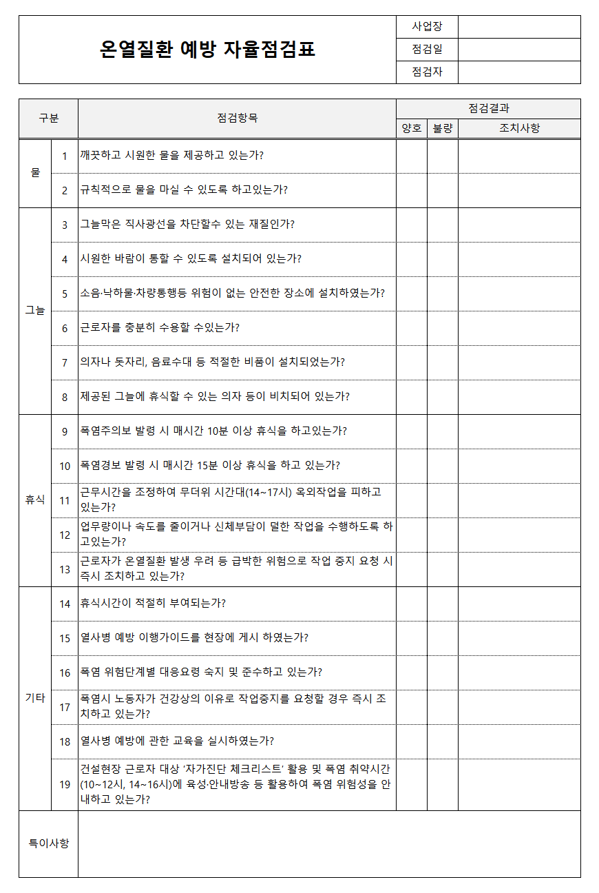 - 기상청 날씨누리 홈페이지등을 통해 기상 상황 확인, 근로자에게 폭염정보 제공 - 시원하고 깨끗한 물과 근로자가 쉴 수 있는 그늘*휴식공간) 준비 - 열사병 등 *온열질환 민감군 및 *작업강도가 높은 힘든 작업 사전 확인 및 구분 *온열질환 민감군] 비만, 당뇨, 고혈압/저혈압 등 질환자 / 온열질환 과거 경력자 / 고령자 / 폭염 노출작업 신규배치자 *작업강도가 높은 힘든작업 (예시)삽,망치, 톱, 곡굉이, 도끼등을 이용하거나 건설현장에서 형틀,철근타설 작업 등 전신을 움직이는 작업 또는 중량물을 수작업에 의해 반복적으로 들고 내리거나 취급하는 작업 |