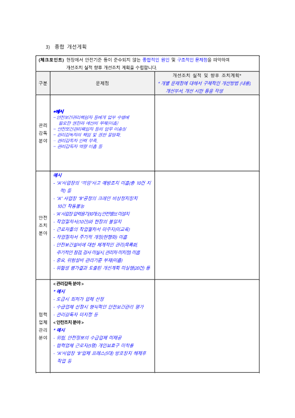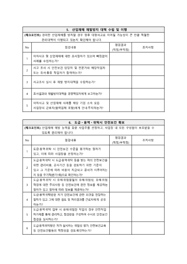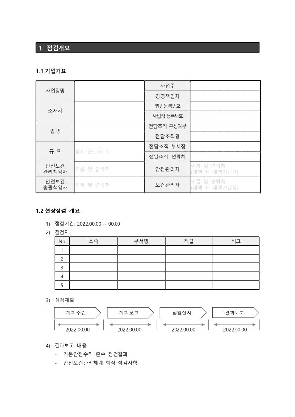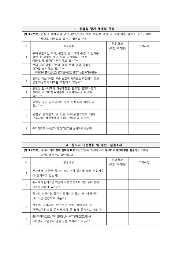 양식은 노동부양식이 한글로 되어있어 워드파일로 살짝 바꿔봤다. 어차피 보고할때는 PPT로 만들어 보고하는게 깔끔하기 때문에 그냥 점검할때 사용하면 좋을것같다.