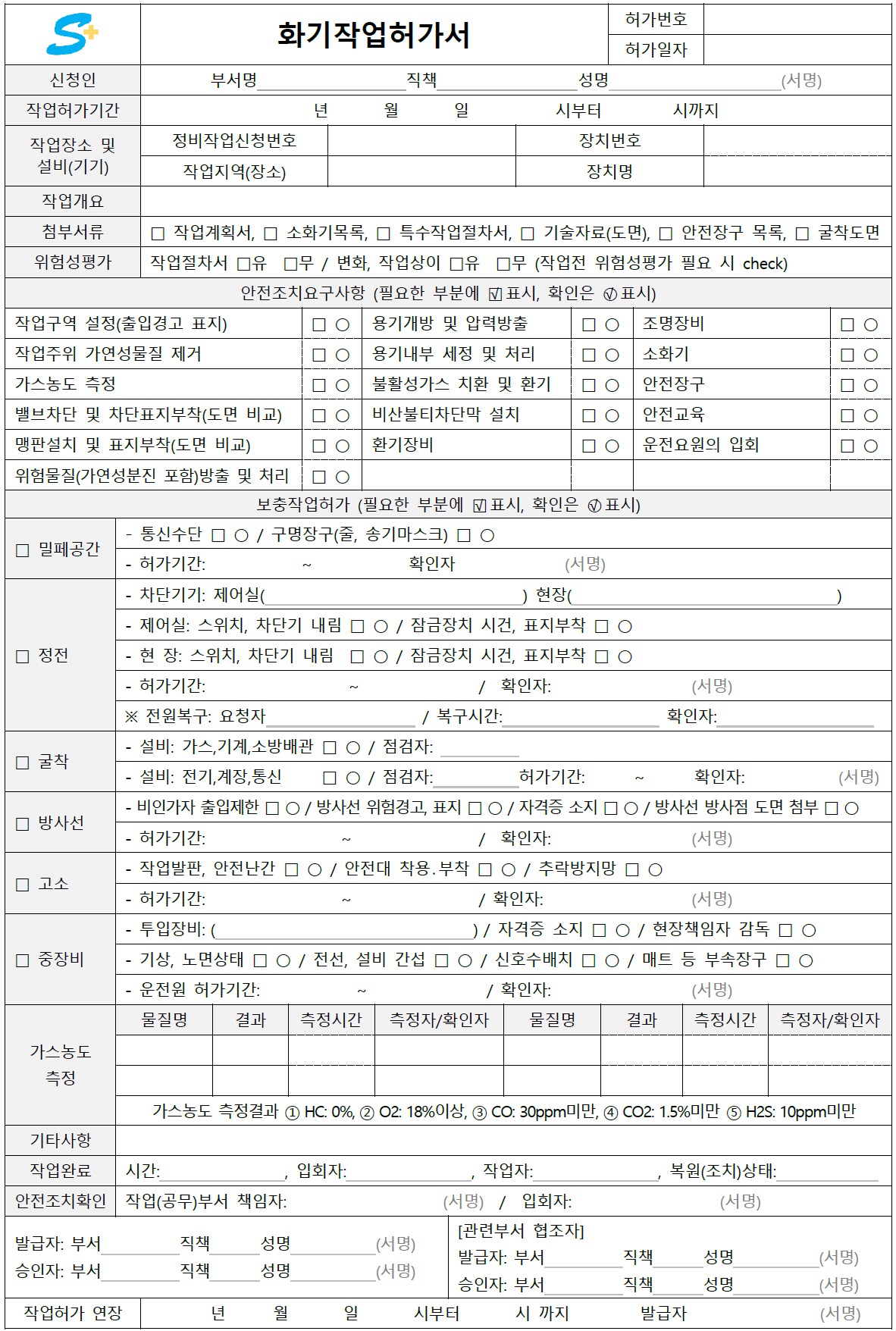 | 3. 보충적인 작업허가 | 1) 밀폐공간 출입 작업허가 | 질식 및 가연성가스 체류 위험이 있는 장소 출입 |