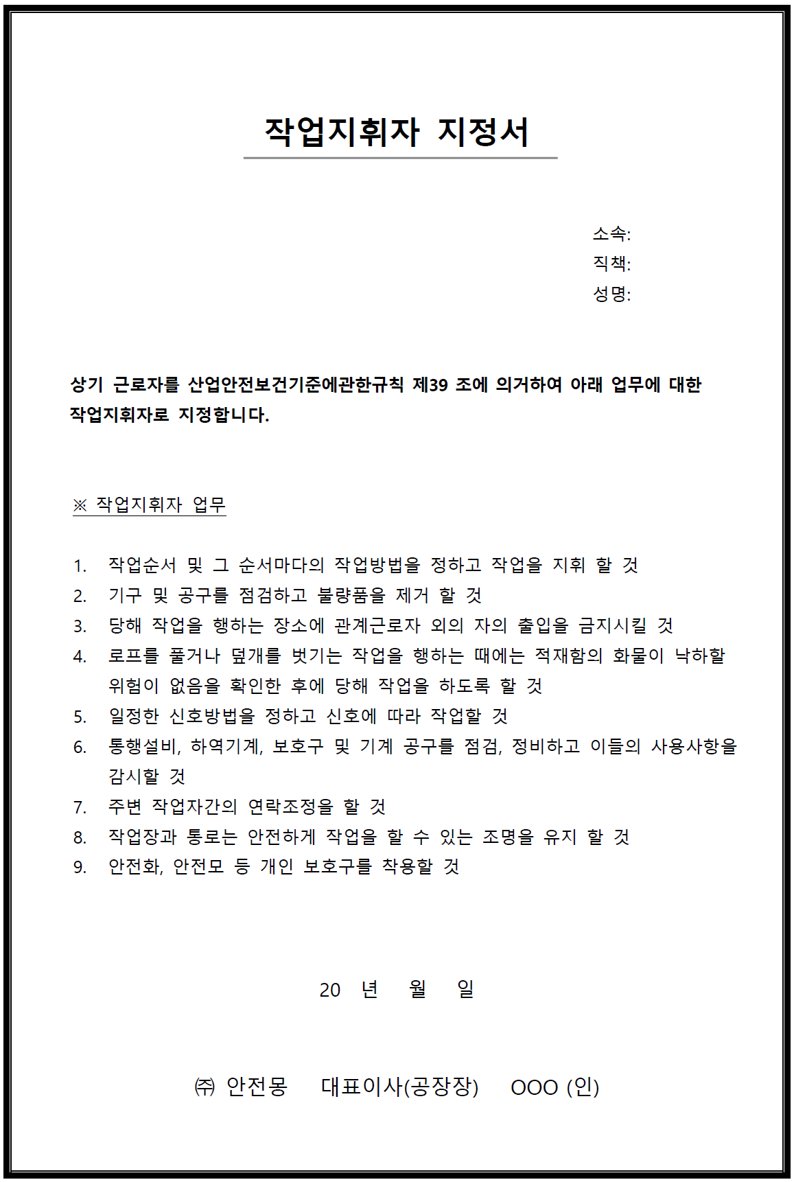 작업의 지휘자를 지정하여 다음 사항을 준수