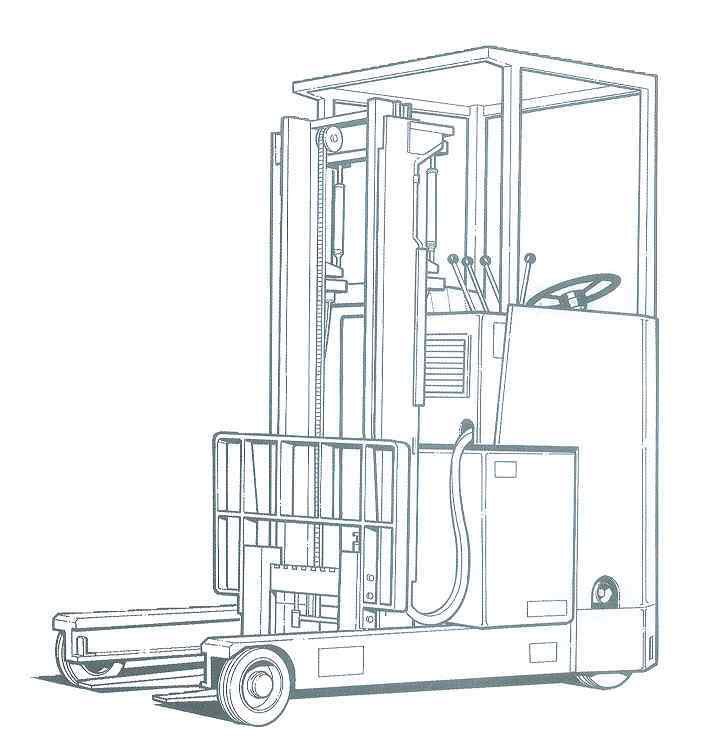 차체 전방으로 튀어나온 아웃트리거에 의해 차체의 안정을 유지하고, 그 아웃 트리 거안을 포크가 전후방으로 움직이면서 하역작업을 하도록 되어 있는 지게차이다. 주로 좁은 공간에서 활동영역을 높이기 위한 목적으로 사용되며, 바닥이 고르고 견고한 창고 같은 곳에서 사용하기 적합하다. 동력원은 배터리이며 후륜구동 및 후륜 조향 방식을 채택하고 있다.