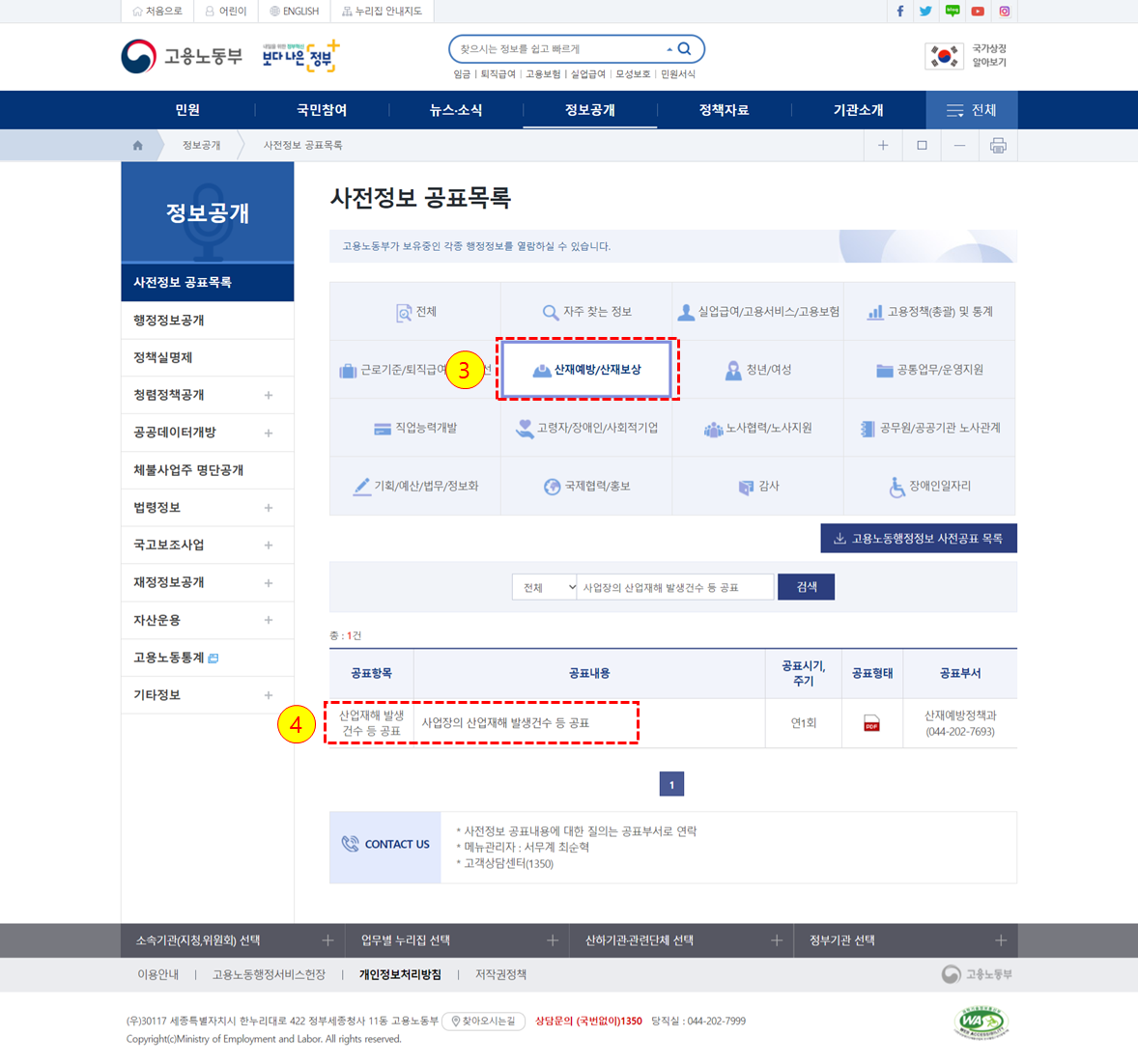 - 고용노동부 홈페이지 접속 → 사전정보공표목록 선택 → 산재예방/산재보상 선택 → 산업재해 통계자료 선택 → 공표목록 확인