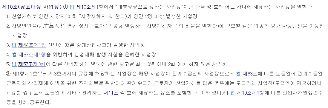 2) 산업안전보건법 시행령 제10조(공표대상 사업장)
