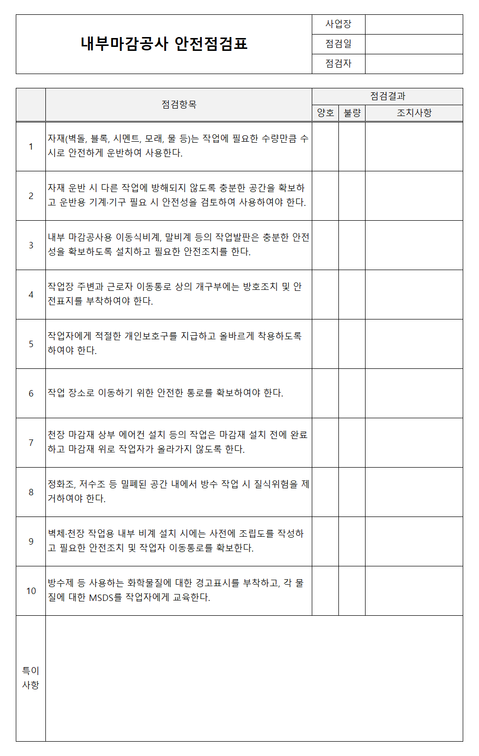 외부 마감공사 안전점검표 (0) | 2023.01.29 |
