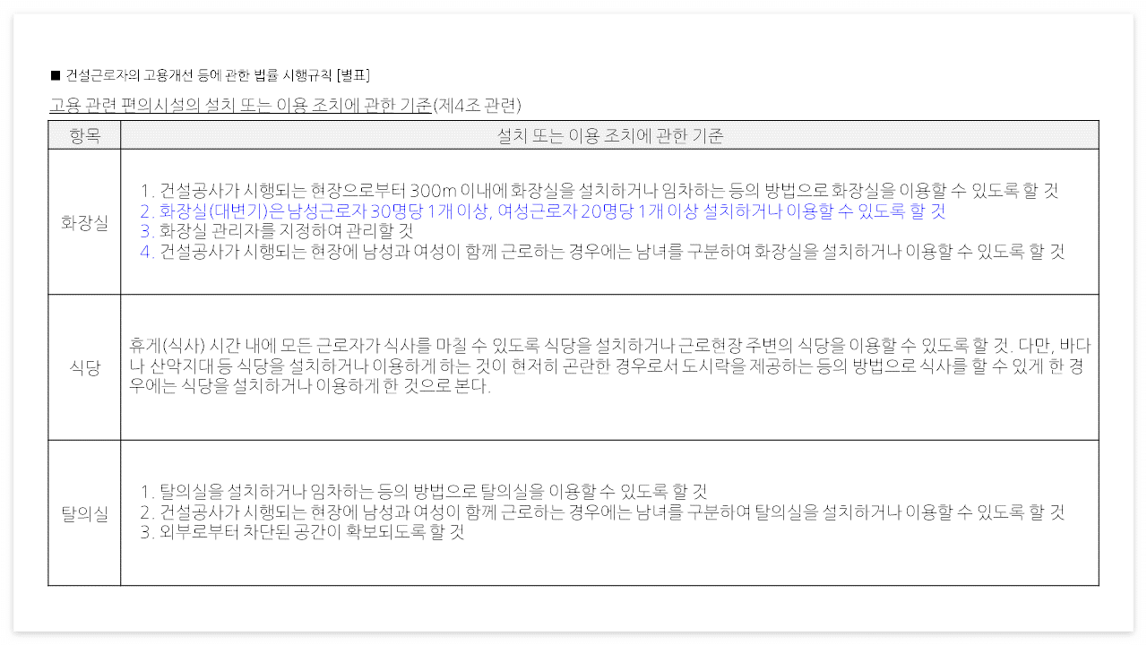 고용노동부에서는 1.30~3.13일 까지 건설현장 화장실 설치기준에 근로자 수 기준 을 추가하여 건설근로자의 고용개선 등에 관한 법률 개정안을 입법예고 했습니다.
