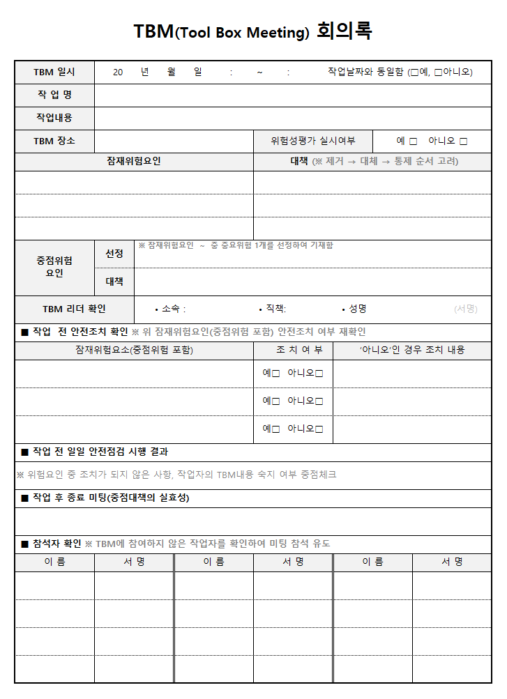 고용노동부에서 밀고있는 위험성평가와 그 결과를 교육하기 위해 TBM을 권고하고 있다. 앞으로 고용노동부 감독 시 에도 이를 점검 할 가능성이 크므로 하기 양식으로 진행하는것을 추천한다.