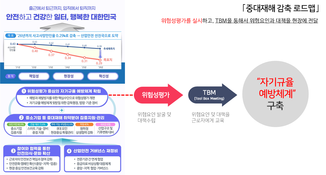 2022년 11월 30일 '중대재해 감축 로드맵'이 발표되었고 가장 핵심내용으로는 위험성평가를 통해 자기 규율 예방체계를 구축하는 것이라고 발표하였습니다. 노사가 함께 참여하여 위험성평가를 실시하고 그 결과를 작업 전 안전점검회의(TBM)를 통해 위험요인과 개선대책을 반복해서 전달교육을 해야만 합니다.