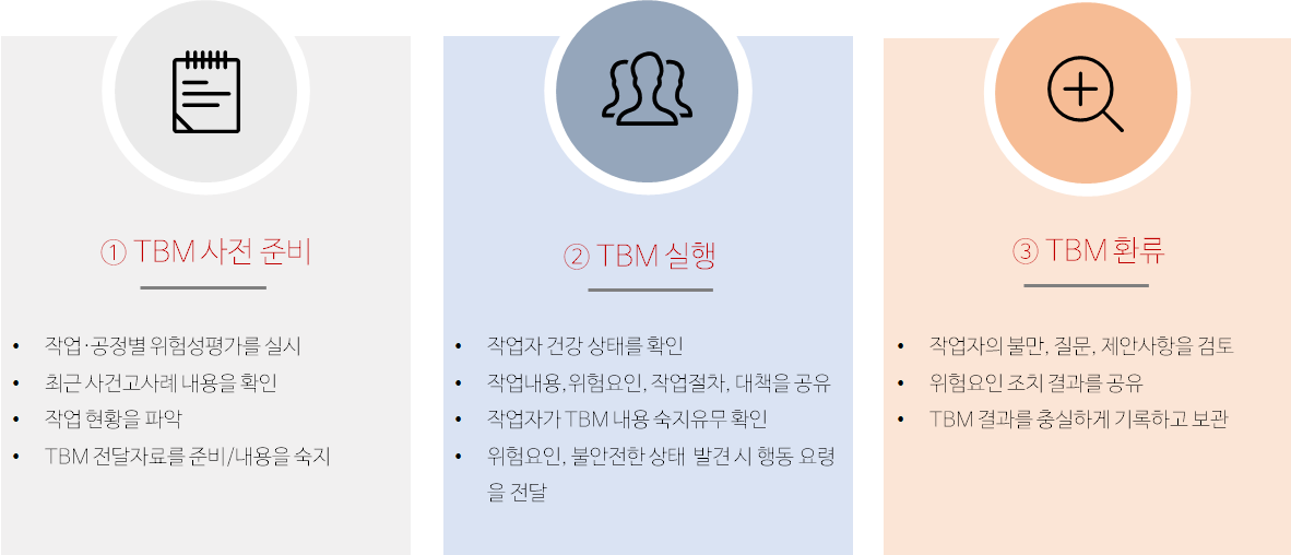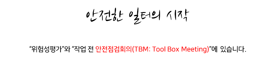 기존에 아침조회를 진행하던 회사에서는 조회시간을 활용하여 TBM 절차를 만들어 교육하고 시행하면 되지만, 조회를 진행하지 않는 회사는 아침조회를 만드는 것이나 다름이 없으므로 사업주와 근로자와의 협의가 반드시 필요합니다. 이 과정에서 안전관리자들이 가장 힘들것으로 생각되는데 욕먹을 각오하고 진행해야만 합니다.